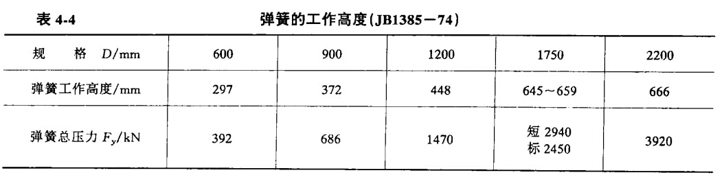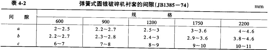 安裝在機架周圍的彈簧6是破碎機的保險裝置。當(dāng)破碎腔中掉入非破碎物時,支承在彈簧上的支承環(huán)和調(diào)整環(huán)力求向上抬起而壓縮彈簧6,從而增大了排料口間隙,使非破碎物經(jīng)排料口排出,避免機件破壞。彈簧的張緊程度對機器的正常工作具有很大的意義。在擰緊彈簧時,應(yīng)考慮到使其留有一定的壓縮裕量。破碎機每組彈簧壓縮后的工作高度見表4-4。