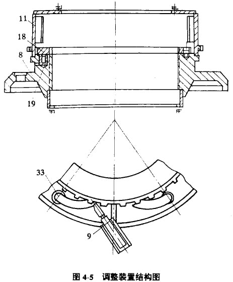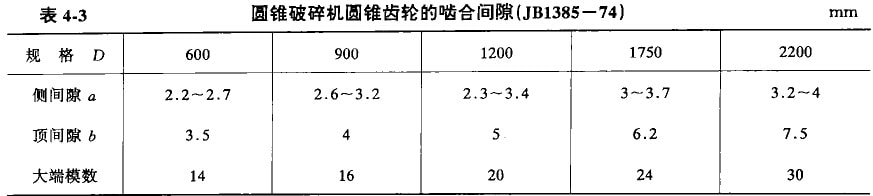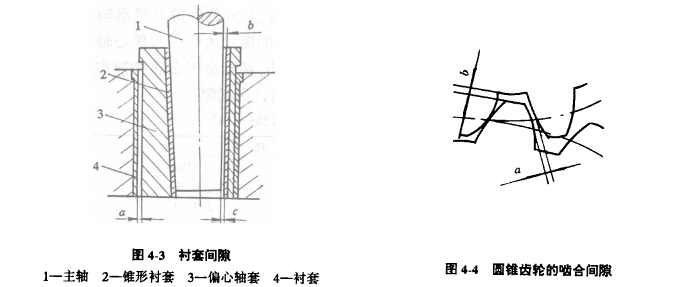 偏心軸套31支承在由三片圓盤組成的止推軸承27上.最下面的鋼圓盤固定在機架下蓋28上,上面的鋼圓盤與偏心軸套用銷釘相聯(lián),并隨之轉(zhuǎn)動,而中間的青銅圓盤則作相對滑動。青銅圓盤的總厚度每年至少要檢查兩次,因為青銅圓盤磨損后,就要減少圓錐齒輪的嚙合間隙。圓錐齒輪嚙合側(cè)面向隙不足.就會在齒面和傳動軸的軸展上產(chǎn)生很大的附加負荷。圓錐齒輪的嚙合間隙,如圖4—4所示。其值見表4-3。