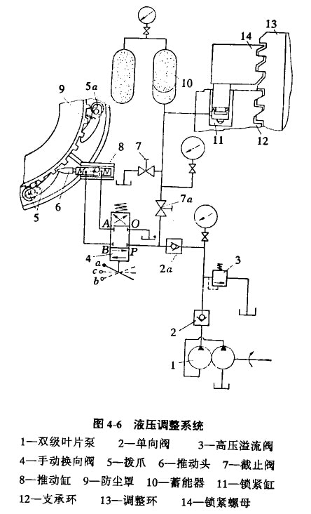 調(diào)整排料口,是靠推動缸8,通過防塵罩9的凸臺,使調(diào)整環(huán)13旋轉(zhuǎn)來實現(xiàn)。調(diào)整過程如下;首先將截止閥7打開,鎖緊缸11油壓從10MPa降至零,使調(diào)整環(huán)13與支承環(huán)12的連接螺紋放松。然后啟動14MPa壓力的雙級葉片泵1,壓力油通過單向閥2,高壓溢流閥3(即安全閥,壓力調(diào)到10MPa)和單向閥2a,進入三位四通手動換向閥4。