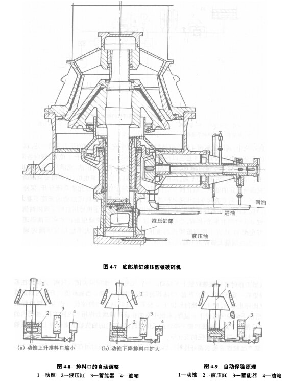 這種破碎機(jī)排料口的調(diào)整是通過油缸中袖量的增加或減少校動(dòng)錐上升或下降,從而使排料口減小或增大,如圖4-8所示。