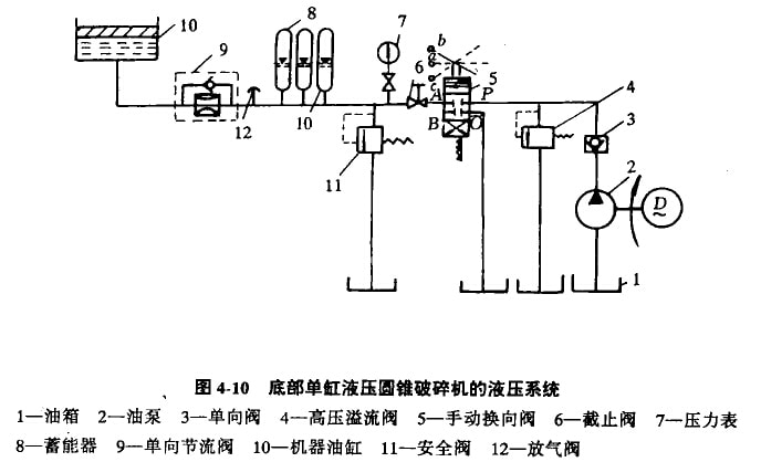 非破碎物排出后,氣體壓力又高于油壓,則進(jìn)入蓄能器內(nèi)的油又被壓回伯缸,使破碎錐恢復(fù)正常工作位置。這種破碎機(jī)的液壓系統(tǒng)如圖4-10所示。