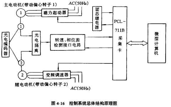 復(fù)合同步振動圓錐破碎機控制系統(tǒng)總體結(jié)構(gòu)原理圖如圖4-16所示。該控制系統(tǒng)由兩臺相同規(guī)格型號的異步電機、電路的控制回路、電機的變頻調(diào)速裝置、一塊數(shù)據(jù)采集卡PCL-711B、一臺微型計算機、轉(zhuǎn)速檢測元件及電路等組成。因檢測系統(tǒng)和控制運算全部是數(shù)字量,所以屬于全數(shù)字控制系統(tǒng)。驅(qū)動兩個偏心轉(zhuǎn)子的兩臺交流異步電機,分別定義為主電機1和隨動電機2.控制隨動電機2使其跟蹤主電機1,實現(xiàn)跟蹤控制。主電機的啟動和停機由磁力驅(qū)動器控制,而磁力驅(qū)動器的交流控制回路由固態(tài)繼電器來控制。CL-711B板的DO2與固態(tài)繼電器的直流控制端聯(lián)接,D02為高電平時,驅(qū)動器接通,電機啟動,DO2為低電平時,驅(qū)動器斷開,電機停止,因此可通過軟件控制主電機啟動和停機。隨動電機由一臺高性能變頻調(diào)速器供電,變頻調(diào)速器的輸出控制方式是v/f為定值的正弦脈寬調(diào)制,并由低頻電壓補償.變頻調(diào)速器的輸出頻率由控制端的直流電壓確定,其電壓值等于PCL板D/A的輸出,所以通過調(diào)節(jié)D/A的輸出即可改變變頻調(diào)速器的輸出功率。兩臺光電編碼器分別安裝在兩臺電機的轉(zhuǎn)軸上,作為轉(zhuǎn)速的檢測元件,可同時檢測兩轉(zhuǎn)子間的相位差。FCL-711B是一塊多功能數(shù)據(jù)采集卡,直接插入微機的總線擴展槽內(nèi),并通過軟件控制,整個系統(tǒng)的開關(guān)量控制、狀態(tài)檢測及模擬量輸出均通過它完成。微機通過光電編碼器從兩臺電機轉(zhuǎn)軸上,接受經(jīng)過檢測系統(tǒng)傳來的信號,并對這些信號進行運算處理,然后再通過數(shù)據(jù)傳輸通道向變頻調(diào)速器輸出控制電壓,實現(xiàn)對隨動電機的跟蹤控制,確保整個機械系統(tǒng)同步同相運轉(zhuǎn),以提高新型振動圓錐破碎機的機械性能。