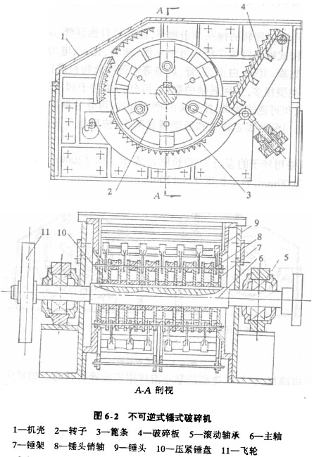 圖6-2是單轉(zhuǎn)子不可逆式錘式破碎機。它由機殼1、轉(zhuǎn)子2、篦條3、打擊板4和軸承5等部分組成。