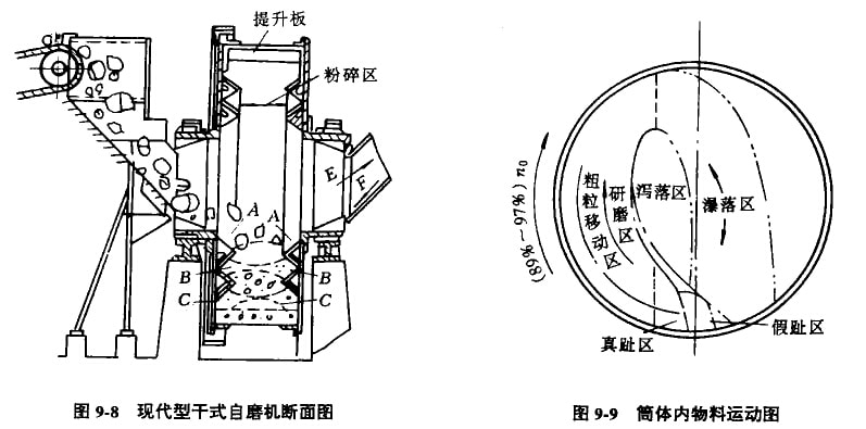 物料在自磨機筒體中的運動狀態(tài),除廠具有一般旋轉(zhuǎn)筒式磨機中介質(zhì)和物料的運動規(guī)律外,由于自磨機(主要指干式自磨機)具有筒體上有提升襯板而在端蓋上有波形襯板和給料大小塊度相差很大的特殊條件,所以使得物料在自磨機筒體中的運動具有自己的特殊性。