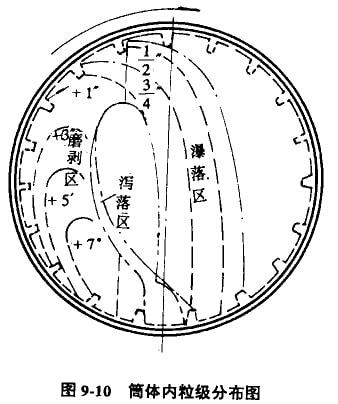 如圖9-8所示,新給料中的小粒,由給料端進入,沿A面均勻地落于筒體底部中心,然后向兩側(cè)擴散,大塊具有較大的動能,總是趨向較遠的一側(cè),但其中有一部分必然要和A,B面相碰,然后向另一側(cè)返問,因之,也使大塊得到均勻分布。A—A,B—B在這里的作用是防止給入物料有害的偏析。自排料端沿F面返問的顆粒如同新給料巾的細粒一樣,均勻地落予筒體底部的中心,然后向兩邊擴散。大塊和細粒在筒體底部沿軸向運動,方向正好相反。于是產(chǎn)生粉磨作用。