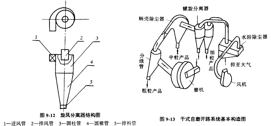 目前干式自磨機采用的風力運送分級系統(tǒng)有兩種:閉路系統(tǒng)和開路系統(tǒng)。我國采用干式自磨機的廠礦,在生產(chǎn)實踐中結合自己的具體條件對管路系統(tǒng)進行了不少的改進。所以風力運送分級管路系統(tǒng)的構造并不完全相同。圖9-11介紹的是閉路系統(tǒng)的基本構造,圖中沒有標注數(shù)字的圓筒表示磨帆,右邊是給料端,左邊是排料端,2表示粗粉分級器(目前多用沉降箱),沉降箱是鋼板焊成的長方體,臥式的長寬較大而高度較;立式的則高度較大,長寬鉸小,有的與風流方向相垂直的斷面上還沒有隔板。粗粉分級器與磨饑排料漏斗之間用風管連通,在粗粉分離器中,粗粒的粉磨產(chǎn)品被分離出來。3表示細粉分離器(圖示兩臺并聯(lián)的旋風分離器)。旋風分離器的結構如圖9-12所示。它由一段圓柱管3與一段圓錐管4構成外筒,在圓柱管的上方有蝸殼形的進風管1,進風管斷面為方形,外筒巾心靠k部有較短的排風管2。錐管的下端有排料管5。