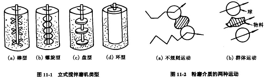 立式攪拌磨機(jī)的種類(lèi)較多,按攪拌器結(jié)構(gòu)形式可分為:棒式攪拌磨、螺旋式攪拌磨、盤(pán)式攪拌磨和環(huán)式攪拌磨,如圖11-1所示;按工作方式可分為:間歇式攪拌磨和連續(xù)式攪拌磨;按粉磨作業(yè)特點(diǎn)可分為:濕式攪拌磨和干式攪拌磨。