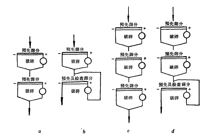 小型選礦廠常采用二段開(kāi)路破種流程(圖1a),第一段一般可不設(shè)預(yù)先篩分。中小型選礦廠常用二段一次閉路破嬸流程(圖1b)成二段 —次閉路破碎流程(圖1d)。大型選礦廠常用三段開(kāi)路破碎流程(圖lc)或三段一次閉路破碎她程(團(tuán)1d)。在處理含水分較高的泥質(zhì)礦 石及易產(chǎn)生大量石英礦塵的礦石時(shí),以采用開(kāi)路破碎流程為宜,因采用閉路破碎時(shí),易使篩網(wǎng)及破碎機(jī)堵塞,或產(chǎn)生很多有害礦塵。