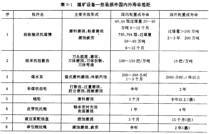 另一方面,我國礦山機(jī)械設(shè)計(jì)相制造過程中由于受傳統(tǒng)習(xí)慣的束縛,及對(duì)摩擦學(xué)知識(shí)缺乏了解,不能將當(dāng)今國內(nèi)外先進(jìn)的抗磨技術(shù)相耐磨材料及時(shí)地應(yīng)用在礦山機(jī)械設(shè)計(jì)制造上,造成我國礦山機(jī)械易磨損機(jī)件的使用壽命遠(yuǎn)遠(yuǎn)低于國外先進(jìn)水平。具體情況見表0-1。