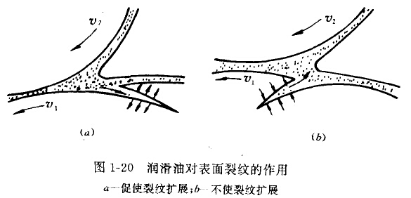 (1)裂紋起源于表面在滑動(dòng)摩擦或滾動(dòng)帶有滑動(dòng)摩擦?xí)r,待別是當(dāng)表面存有缺陷時(shí),裂紋就容易從表面開始。例如兩齒輪在接觸過程中,表面不僅有交變接觸壓應(yīng)力而且還有剪叨應(yīng)力。根抓赫茲的理論,最大壓應(yīng)力發(fā)生在表面上,而最大的剪應(yīng)力發(fā)生在離表面一定距離處。圖1-19為剪應(yīng)力發(fā)生在表面下距離變化曲線。在表面壓應(yīng)力和剪應(yīng)力反復(fù)作用一定周次之后,材料慶面就會(huì)產(chǎn)生局部的塑性變形相加工硬化,在漿些組織不均勻處,密易形成裂紋源,導(dǎo)致裂紋出現(xiàn)與擴(kuò)散。當(dāng)接觸表面存有潤滑油且滾動(dòng)力。向與裂紋端部方向一致時(shí).波動(dòng)物體首先封住裂紋裂口處。(如圖1-20所示),裂紋中的潤滑油被培在裂縫小,在接觸歷應(yīng)力作用下嚴(yán)生高壓油波,迫使裂紋向30°-45°角方向擴(kuò)展。當(dāng)裂紋向內(nèi)表面擴(kuò)展到一定深度都覽度時(shí),裂紋上部如同一懸臂梁承受交變彎肋應(yīng)力,最后因強(qiáng)度不足而折斷成金用磨屑,并留下麻點(diǎn)狀利落坑。