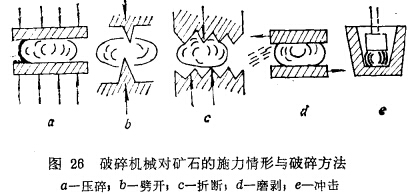 破碎機械對礦塊破碎的施力方式通常有壓碎、劈開、折斷、 磨剝及沖擊等幾種,詳見圖26所示。但作為磨礦機這種借助運動介質(zhì)產(chǎn)生破碎力的機械,能夠?qū)崿F(xiàn)的破碎方法主要是沖擊及磨剝兩種,當(dāng)然也存在壓碎(棒磨機具有)及劈碎(自磨機的環(huán)形波峰襯板具有)作用,但目前磨礦機中的破碎力形式主要還是沖擊力及剪切力。