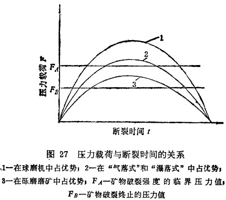 可見,施加大的載荷時斷裂的時間增加,選擇性破碎作用減弱; 施加小的載荷時,斷裂的時間縮短,選擇性破碎作用增強,這時只有易斷裂的地方才會斷裂。圖27曲線1是施以較大載荷的情況, 破裂的時間長,選擇破碎作用差,(載荷較大的情況在球磨機中占優(yōu)勢),曲線3是施以較小載荷的情況,破裂的時間短,只有沿易碎(較弱)的礦物處才會破裂,選擇破碎作用強(在礫磨機中載荷較小的情況占優(yōu)勢),曲線2是施以中等載荷的情況,破裂的時間比大載荷短而比小載荷長,破碎的選擇性比大載荷好而比小載荷差(載荷中等的情況在自磨機中占優(yōu)勢)。由三種載荷的破碎特性可知:球磨機磨礦是選擇性破碎作用最差的磨碎過程;礫磨機及自磨機磨礦則具有較強的選擇磨碎作用,礦物之間沿結(jié)合面解離的情況比球磨機多。