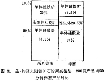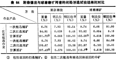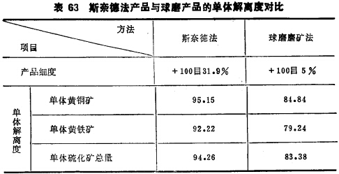 用磁鐵礦、斑巖銅礦、銅鎳礦、鋁釩土和石棉等作此方法的半工業(yè)性對比試驗得出:破砟的產(chǎn)品比球磨或棒磨解離度髙,過粉碎輕,回收率和精礦品位都高于球磨或棒磨。圖29~31和表63 和表64列出了斯奈德法的產(chǎn)品單體解離度,精礦品位及回收率與棒磨及球磨的對比結果?梢,這種方法比較優(yōu)越,影響推廣應用的主要障礙是快速閥門的磨損嚴重。