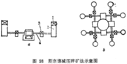 為了提高破碎效率,在改進現(xiàn)有設備的同時,還研究了破碎礦石的其他物理新方法,如電熱照射、液電效應、熱力破碎、減壓破碎等。但是,這些方法多處于初期研究階段,只有A •斯奈德減壓碎礦法完成了半工業(yè)對比試驗。