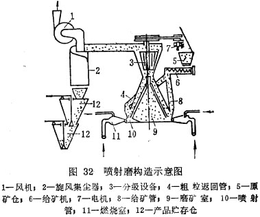 噴射磨礦機也是一種解離度髙及選擇性磨碎作用強的新型細磨機,圖32是圓錐型氣流噴射式磨礦機的構造示意圖。噴射式磨礦機的工作過程及原理主要是利用髙溫壓縮空氣(或過熱蒸汽或其它預熱氣體)作介質(zhì),當壓縮空氣在燃燒室11預熱后,經(jīng)噴射管10的噴咀放出,因其突然減壓體積膨脹,以100~200m/s速度運動的氣流,將來自給礦管8落下的5~3mm的被磨物料沿切線方向吹入圓錐形的磨礦室內(nèi),利用高速運動著的礦粒間相互沖擊及磨剝即可達到自行碎裂。已粉碎的礦粒在分級設備的配合下進行分級,其中合格產(chǎn)品被氣流帶入旋風集塵器,粗顆粒則經(jīng)返回 管再度落入磨礦室的底部重新粉碎。