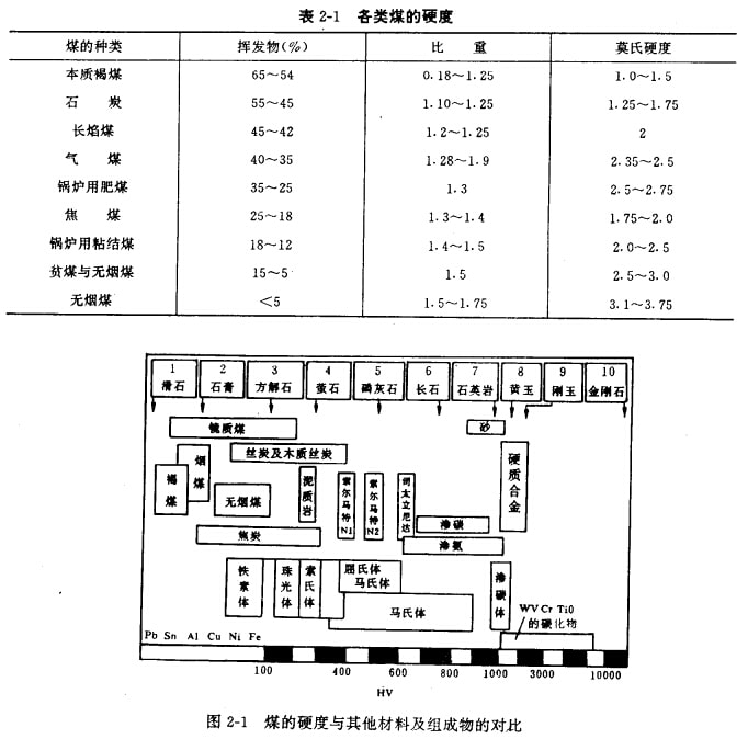 對(duì)磨損來說,硬度是重要的因素,煤的硬度是較低的,根據(jù)普拉托諾夫資料,各種煤的硬度如表2-1所示.煤的硬度與標(biāo)準(zhǔn)礦物及某些金屬材料和鋼中組成物的對(duì)比見圖2-1。