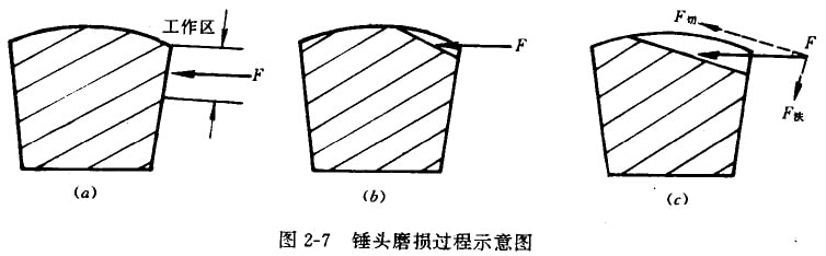 錘頭打擊物料的區(qū)域為工作面(見圖2-7a),隨工作面不斷被磨損工作面將發(fā)生(圖2-7b,c所示)變化,物料對錘頭的磨損方式也將發(fā)生變化,初期錘頭以被撞擊受力方式為主,當(dāng)被磨損到一定程度時,物料將對錘頭工作面及瑞頭產(chǎn)生沖刷作用。當(dāng)錘頭磨到一定尺寸后由于工作效率低,破碎物料粒度過大,就需更換錘頭了。