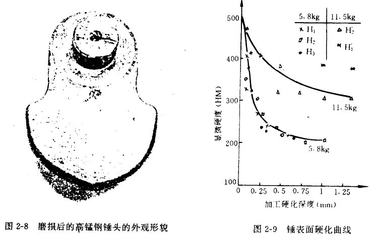 磨損失效后的高錳鋼錘頭見圖2-8。高錳鋼具有表麗加工硬化特性。當(dāng)受到物料幢擊時。恢錘頭表面產(chǎn)生撿洛吭們出現(xiàn)加工硬化層。高錳鋼耐磨性好壞,主要決定于加工硬化層的深度和硬度,圖2-9是5.8kg錘頭和11.5kg錘殘體加工硬化曲線。由圖2-9可知,兩種錘頭的加工硬化效果很差,尤其是5.8kg錘頭,其最高加工硬度僅HM530,且加工硬化層不到0.5mm?梢哉J(rèn)為這種上況條件下高錳鋼錘頭磨損屬于低沖擊磨料磨損,是造成高錳鋼錘頭耐磨性差的主要原因。