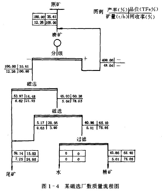如果在線流程因上把各產(chǎn)物(包括原礦和中間產(chǎn)物)的礦量、質(zhì)量分?jǐn)?shù)、水量和各作業(yè)的補(bǔ)加水量均標(biāo)出來(lái),則稱為礦漿流程圖,如圖1-5所示。通過(guò)此圖可了解各作業(yè)及產(chǎn)物的質(zhì)量分?jǐn)?shù)和耗水量,也是指導(dǎo)生產(chǎn)的依據(jù)之一。