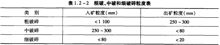 根據(jù)給礦粒度和最終破碎產(chǎn)品粒度要求,破碎分一段、兩段、三段破碎。三段破碎分別為粗破、中破和細(xì)破碎,參見表1.2-2。
