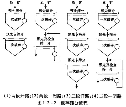 破碎篩分流程包括破碎作業(yè)和篩分作業(yè)。因礦石經(jīng)過破碎機(jī)次數(shù)的不同分為兩段和三段破碎;又按有無檢查篩分作業(yè)而分為閉路和開路兩種。如圖1.2-2。