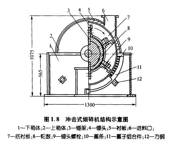 沖擊式細(xì)碎機(jī)是—種錘式破碎機(jī),具有產(chǎn)品粒度細(xì)、破碎比大、產(chǎn)量高等特點(diǎn),適于將各種粒度小于60mm的中硬物料細(xì)碎到5mm 以下(占產(chǎn)量的80%左右)。合肥水泥研究設(shè)計(jì)院設(shè)計(jì)的CXL-ø800mm×300mm沖擊式細(xì)碎機(jī)的結(jié)構(gòu)如圖1.8所示。