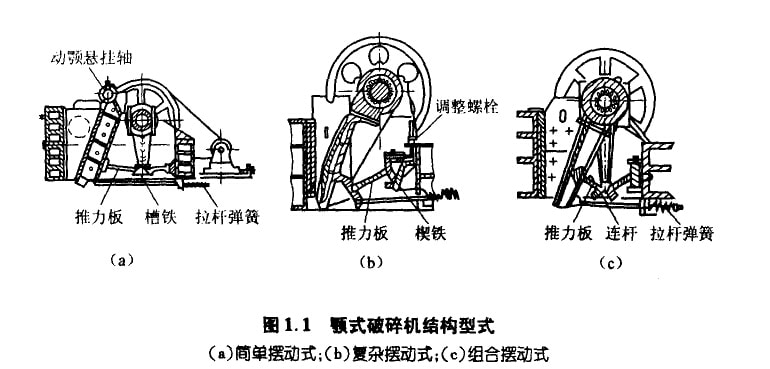 顎式破碎機(jī)按活動(dòng)顎板的運(yùn)動(dòng)狀態(tài)可分為簡(jiǎn)單擺動(dòng)、復(fù)雜擺動(dòng)和組合擺動(dòng)三種類型,如圖1.1所示。圖中(b)和(c)型顎式破碎機(jī) 的共同特點(diǎn)是:物料塊在破碎顎板之間除受擠壓作用外,同時(shí)還受研磨力的作用,因此破碎效率較高。顎式破碎機(jī)排料口的大小,可通 過(guò)調(diào)整座楔塊的升降進(jìn)行調(diào)節(jié)。設(shè)備的安全裝置由支承動(dòng)顎的肘板兼顧,當(dāng)破碎腔內(nèi)進(jìn)入堅(jiān)硬異物時(shí),設(shè)備超員荷運(yùn)行致使肘板首先斷 裂,從而使設(shè)備受到保護(hù)。