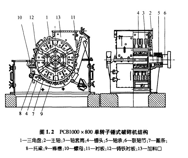 錘式破碎機(jī)按回轉(zhuǎn)軸的軸數(shù)分類,有單轉(zhuǎn)子和雙轉(zhuǎn)子兩種型式;按轉(zhuǎn)子回轉(zhuǎn)方向分類,有可逆式和不可逆式之區(qū)別。錘式破碎機(jī)的捶 頭結(jié)構(gòu)和村質(zhì)是決定產(chǎn)品質(zhì)量和破碎效率的重要部件.為了延長(zhǎng)錘頭的使用壽命,一般在錘頭的兩端均開設(shè)安裝孔,以便調(diào)頭安裝或正 反面調(diào)換使用。圖1.2和圖1.3分別為單轉(zhuǎn)子和雙轉(zhuǎn)子錘式破碎機(jī)的結(jié)構(gòu)原理圖。雙轉(zhuǎn)子捶式破碎機(jī)設(shè)有‘v”形篦條,在一 對(duì)轉(zhuǎn)子的上錘頭之間構(gòu)成了一個(gè)預(yù)破碎腔,大塊物料在進(jìn)入兩回轉(zhuǎn)軸形成的兩個(gè)細(xì)碎腔之前,先進(jìn)行預(yù)破碎,因此,這種破碎機(jī)具有破 碎比大、喂料均勻、兼有預(yù)碎和細(xì)碎兩段破碎功能等特點(diǎn),常被用作石灰石一段破碎系統(tǒng)。