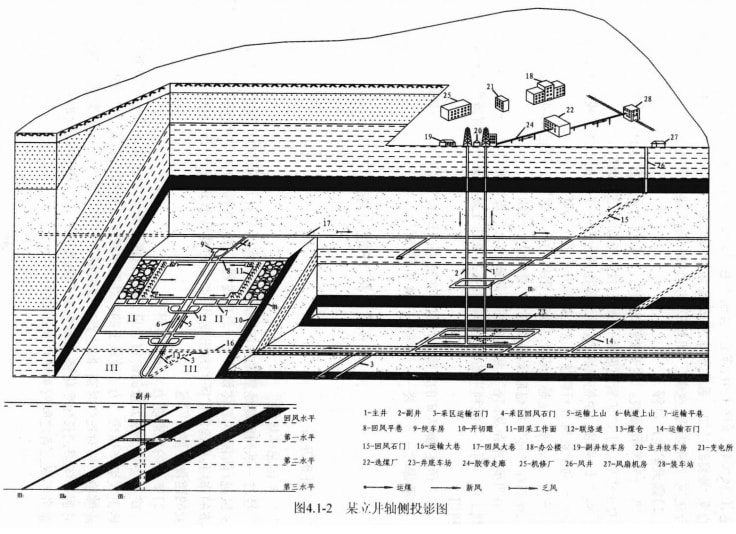 圖4.1-2是某礦井(立井)生產(chǎn)過程的軸側(cè)投影圖。從圖中可以看出,該礦井開采三個煤層。為了開采和運輸煤炭,需要開掘的井巷有:主井、副井、并底車場、石門、運輸大巷、回風(fēng)大巷、采區(qū)上山、煤倉、運輸平巷、回風(fēng)平巷,回來工作面等。從井下提運到地面的煤,需要經(jīng)過加工后裝車外運,故還需要在地面工業(yè)場地布置主副井井架、浴室燈房聯(lián)合建筑、皮帶走廊、選煤廠、機修廠、辦公樓等地面建構(gòu)筑物。