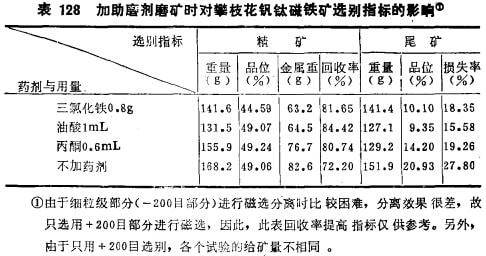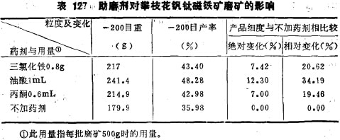 昆明工學(xué)院劉升明在用純礦物混合物進行選擇性磨礦研究的基礎(chǔ)上,又進一步用實際鐵礦石進行了驗證硏究。實際鐵礦石取自四川塔枝花鐵礦密地選廠的細碎產(chǎn)品(粒度20-0mm),經(jīng)破碎后取出5~3mm級別作試料;選擇三氯化鐵、油酸及丙酮為助磨劑;磨礦濃度為65%,磨礦時間20分鐘。試驗結(jié)果表明,三種助磨劑均有顯著助磨效果,加藥與不加藥的磨碎結(jié)果差異顯著,如-200目產(chǎn)率的絕對變化率增加7~12%,而相對變化率則增加20-34%,詳見表127所示;磨碎產(chǎn)品進行磁選處理,得出精礦及尾礦,結(jié)果見表128所示。表128說明,加助磨劑后選別產(chǎn)品的精礦回收率有顯著提高(這里只考查了+200目部分),而尾礦中的金屬損失率大太降低。這也證明磨礦產(chǎn)生了顯著的選擇性解離,提髙了磨礦產(chǎn)品的單體解離度,所以尾礦中連生體少,金屬損失少,尾礦品位低。
