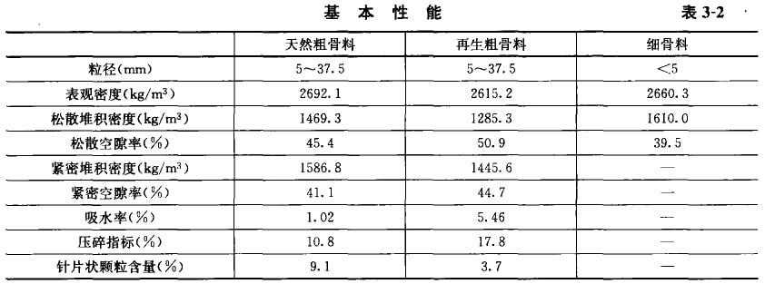 從表3-2可見,再生粗骨料中針片狀顆粒含量為3.7%,天然粗月料的針片狀顆粒含量為9.1%。骨料中的針片狀顆粒不僅本身受力時易折斷,而且含量較多時會增大骨料的空隙率,使混凝土拌羽吻和易性變差,同時降低混凝土強皮。因此,單就針片狀顆粒含量來說,再生粗骨料優(yōu)于天然粗骨料。
