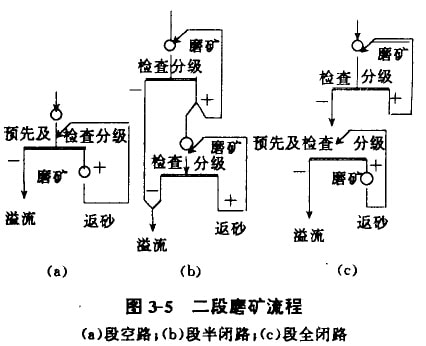磨礦分干磨和濕磨兩種。生產(chǎn)實際中以濕磨為主。磨礦作業(yè)一般分兩段進行,見圖3-5。第一段將給的12-20mm礦磨至0.3-0.2mm。第二段磨礦粒度為0.1-0.074mm。磨礦機一般與分級機組成閉路進行工作。