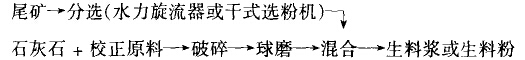 與普通的水泥制造方法一樣,尾礦水泥的生產(chǎn),仍采用“兩磨一燒”的工藝流程。但其工藝參數(shù)應(yīng)作適當調(diào)整。以硅酸鹽水泥為例: