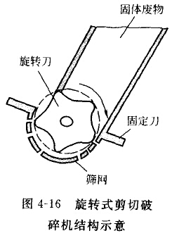 圖4-16所示為旋轉(zhuǎn)式剪切破碎機結(jié)構(gòu)示意。它內(nèi)固定刃(1-2片)和旋轉(zhuǎn)刃(3-5片)組成。固體廢物給人料斗,依靠高速轉(zhuǎn)動的旋轉(zhuǎn)刃和固定刃之間的間隙擠壓和剪切破碎,破碎產(chǎn)品經(jīng)篩縫排出機外。該機的缺點是當(dāng)混人硬度較大的雜物時,易發(fā)生操作事故。這種破碎機適合家庭生活垃圾的破碎。
