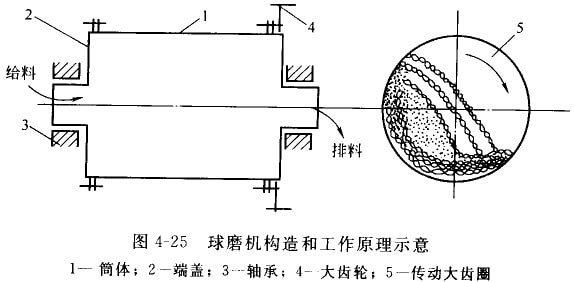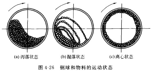 圖4-25為球磨機構(gòu)造和丁作原理示意。它由圓柱形筒體、筒體兩端端蓋、中空軸頸、軸承和傳動大齒圈組成。在筒體內(nèi)裝有鋼球(直徑為25-150nml)。其裝入量為筒體有效容積的25%-50%,筒體兩端的中空袖頸有兩個作用:一是應(yīng)軸頸的支承作用,使球墨機全部重量由中空軸須傳給軸承和機座;二是起給料和排料的漏斗作用,電動機通過聯(lián)軸器和小齒輪帶動大齒圈和筒體緩緩轉(zhuǎn)動。筒體內(nèi)壁設(shè)有襯板,侖同時起到防止筒體磨損和提升鋼球的作用。當筒體轉(zhuǎn)動時,鋼球和破碎物料在摩擦力、離心人和襯板的共同作用下,被襯板帶動提升。征在升到一定高度后,由于自身重力的作用處得鋼球和物料產(chǎn)土自由瀉路和拋落(圖4-26),從而對筒體內(nèi)底腳區(qū)的物料產(chǎn)個外擊和研磨作用。物料粒徑達到要求后出風機抽出。