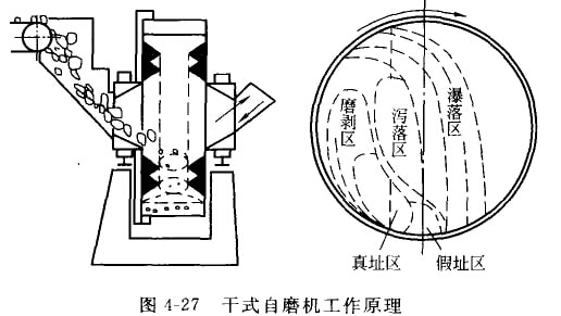 自磨機又稱無介質(zhì)磨機,分干磨和濕解購種。圖4-27所示為干式自磨機工作原理。干式自磨機由給料斗、短筒體、傳動部分和排料斗等組成。給料粒度一般300-400mm,一次磨細到0.1mm以下,粉碎比可達3000-4000,比球磨機等有介質(zhì)磨機大數(shù)十倍。