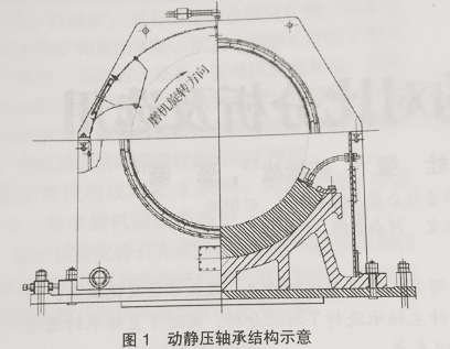 最初磨機(jī)規(guī)格較小時(shí),基本上都是用此類主軸承。其工作原理是,磨機(jī)還沒(méi)運(yùn)轉(zhuǎn)時(shí),先啟動(dòng)潤(rùn)滑站的高壓泵,高壓油進(jìn)入到主軸承的油腔中頂起中空軸,在軸承和中空軸之間形成一層油膜,當(dāng)磨機(jī)筒體開(kāi)始旋轉(zhuǎn)時(shí),利用軸承的楔形油腔產(chǎn)生的動(dòng)壓效應(yīng),在軸承和中空軸之間形成一層穩(wěn)定的油膜,同時(shí)潤(rùn)滑站的高壓系統(tǒng)停止供油,低壓系統(tǒng)向主軸承的頂部供 低壓油,低壓油灑在旋轉(zhuǎn)的中空軸上,對(duì)已經(jīng)形成的油膜進(jìn)行油量補(bǔ)充。動(dòng)靜壓軸承的結(jié)構(gòu)如圖1所示。