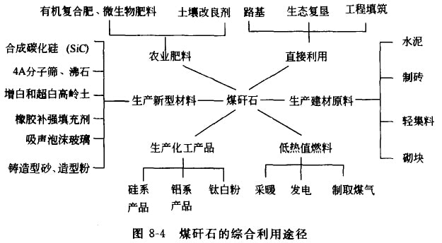 各地的經(jīng)驗表明,煤矸石是寶貴的不可更新資源,它兼有煤、巖石、化工原料及元素資源庫等特性。作為煤它可用作研石電廠和礦山沸騰爐的燃料,利用其余熱,制成型煤還適合層燃爐使用;作為巖石,它在理材領(lǐng)域用途廣泛,如生產(chǎn)水泥、制磚瓦、鋪路,既可以替代黏土和石料,又能節(jié)約能源;作為化工原料,由于煤酐石中硅、鋁等元宏的含量商,可以制備硅系化學(xué)品、鋁系化學(xué)品,如硅酸鈉、硫釀鋁、聚合氯化鋁等,并可用來生產(chǎn)某些新型材料,如Sic、分子篩等;而由于煤酐石臺有硫、鐵、鋇、鈣、鈷、鎵、釩、鍺、鉭、鈾等50多種微量元素和稀有元隸,當某種元素或某幾種元素富集到具有工業(yè)利用價值時,還可對其加以回收利用。煤殲石的綜合利用途徑如圖8-4所示。
