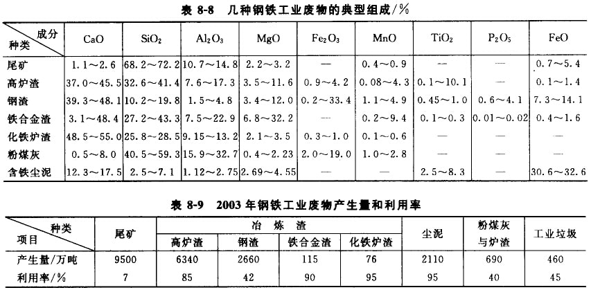 隨著鋼鐵工業(yè)的蓬勃發(fā)展,近幾年我國(guó)鋼鐵產(chǎn)量已穩(wěn)居世界首位,2003年我國(guó)鋼產(chǎn)量已達(dá)到2.2億噸,接近世界總產(chǎn)量的20%;但同時(shí)也排放了約1.7億噸的廢物,包括開采廢石、選礦尾礦、高爐渣、鋼渣、鐵合金渣、含鐵塵泥、粉煤灰等,其典型組成如表8-8所示。