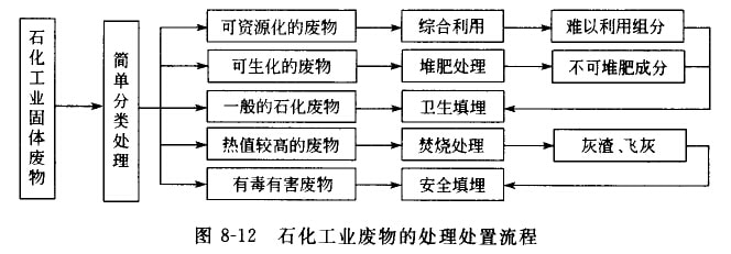 石化工業(yè)固體皮物的組成、性質(zhì)不同,處理處置方式也有差異,如圖8-12所示,經(jīng)簡(jiǎn)單分類處理后,有綜合利用價(jià)值的廢物,如廢催化劑、白土渣、吸附劑等,經(jīng)各種方法回收有用物質(zhì)后,方可進(jìn)一步處理;有機(jī)物和水分含量較高的廢物,如活性污泥、有機(jī)物殘邊等可先堆肥化處理,然后再進(jìn)行無(wú)害化填埋處置;一般的工業(yè)廢物,如濾布、包裝材料、渣土等可直接進(jìn)行衛(wèi)生填埋處置;熱值較高的廢物,如泊泥、廢低聚物、煉泊浮渣等可送去焚燒,產(chǎn)生的灰滔和飛灰,經(jīng)同化處理后,應(yīng)與有毒有害廢物‘道進(jìn)行安全填埋處理。