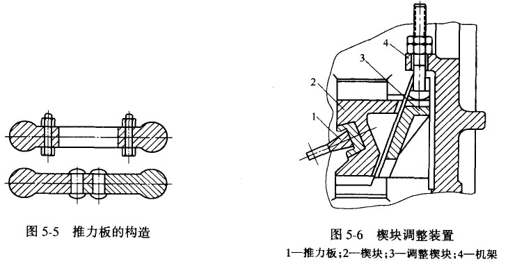 (1)楔塊調(diào)整裝置。如圖5-6所示,它是用放在后椎力板座與機(jī)架后壁問的兩個(gè)楔塊2和3來調(diào)整。使調(diào)整楔塊3沿機(jī)架后壁L升和下降,即可將排礦口減小和增大。用此法調(diào)整排礦口的大小,可以達(dá)到無級(jí)調(diào)整,方便省力,且可不必停車。但缺點(diǎn)是使機(jī)架的尺寸和質(zhì)量增大,且不易調(diào)乎,故使推力板和連桿受力不均,所以這種裝置,只適用于中、小型碎礦機(jī)。