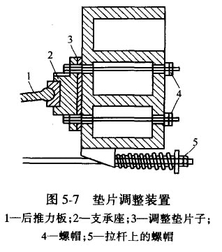 (2)墊片調(diào)整裝置。如圖5-7所示,在后推力板1的支承座2后面放入一組厚度相同的墊片3,改變墊片的數(shù)量,即可達(dá)到調(diào)整徘礦口大小的目的。在調(diào)整排礦口時(shí),要先特螺帽4及拉桿彈簧螺帽5松開,然后增加或減少墊片的數(shù)目,待排礦口調(diào)整好后,再將螺帽4上緊,并調(diào)整彈簧上的螺帽5。用此法可以達(dá)到多級(jí)調(diào)整,調(diào)整時(shí)也比較方便,同時(shí)可以使機(jī)器結(jié)構(gòu)緊湊和質(zhì)量減小。但調(diào)整時(shí)必須停車。這種方法常用在大、中型碎礦機(jī)上。