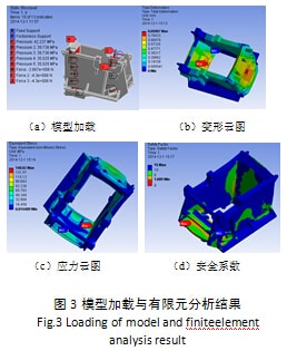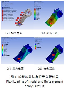 前處理結(jié)束后,對動顎的模型進(jìn)行靜力學(xué)求解,動顎結(jié)構(gòu)約束與加載應(yīng)力變形和安全系數(shù)圖如圖4所示: