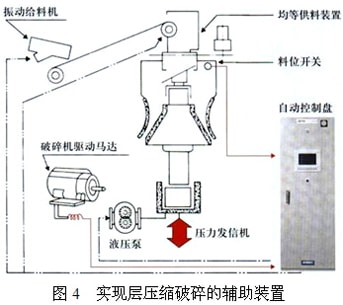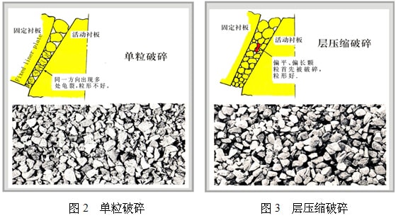 一般型號(hào)的設(shè)備為了得到較小的產(chǎn)品得把排料口調(diào)整得較小或利用特殊形狀的腔形,此種破碎是一個(gè)個(gè)的單粒直接壓縮的破碎方式,其結(jié)果是破碎機(jī)能力不能充分發(fā)揮,另外也因原料的負(fù)荷變動(dòng)、水分等影響性能受明顯影響,造成通過(guò)量小,細(xì)粒的生產(chǎn)量也小,偏平偏長(zhǎng)的產(chǎn)品多粒形不好(圖2),產(chǎn)品強(qiáng)度低,機(jī)械負(fù)荷大,機(jī)械的耐久性不好,有時(shí)不能平穩(wěn)運(yùn)轉(zhuǎn)。為了從根本上解決問(wèn)題,破碎機(jī)改變了細(xì)碎的概念:加大排料口間隙,即使出口間隙大,只要滿(mǎn)足適當(dāng)壓縮的做功條件,就有可能生產(chǎn)出更多的細(xì)粒產(chǎn)品。實(shí)現(xiàn)層壓縮破碎的設(shè)備出口間隙大并利用特殊的破碎腔形成復(fù)數(shù)的粒子層、提高破碎腔內(nèi)的巖石密度、將破碎能量充分加給巖石,以達(dá)到破碎的目的(圖3)。為了實(shí)現(xiàn)層壓縮破碎,均勻布料裝置不可缺少,以防止原料粒度偏析、達(dá)到穩(wěn)定運(yùn)轉(zhuǎn),破碎壁與軋臼壁磨損均一,零部件壽命長(zhǎng);為了實(shí)現(xiàn)層壓縮破碎,自動(dòng)控制系統(tǒng)也不可缺少,該系統(tǒng)隨時(shí)監(jiān)視液壓系統(tǒng)的壓力值、主電機(jī)的電流值及料位,根據(jù)負(fù)荷條件自動(dòng)調(diào)整排料口間隙,以便能在最大負(fù)荷下運(yùn)轉(zhuǎn),獲得更大的產(chǎn)量及更好的粒形(圖4)。單粒破碎一般等于排料口尺寸的產(chǎn)品產(chǎn)量約占通過(guò)量的50%,層壓縮破碎一般等于排料口尺寸的產(chǎn)品約占通過(guò)量的70-80%(圖5)。
