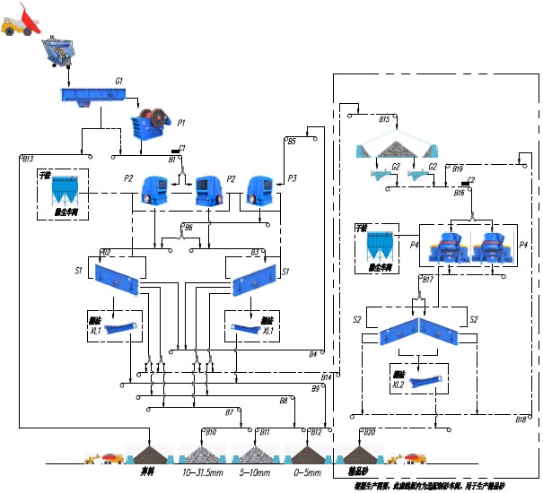 800t/h---石灰石(白云巖)類(lèi)巖石的砂石骨料生產(chǎn)工藝流程示意圖