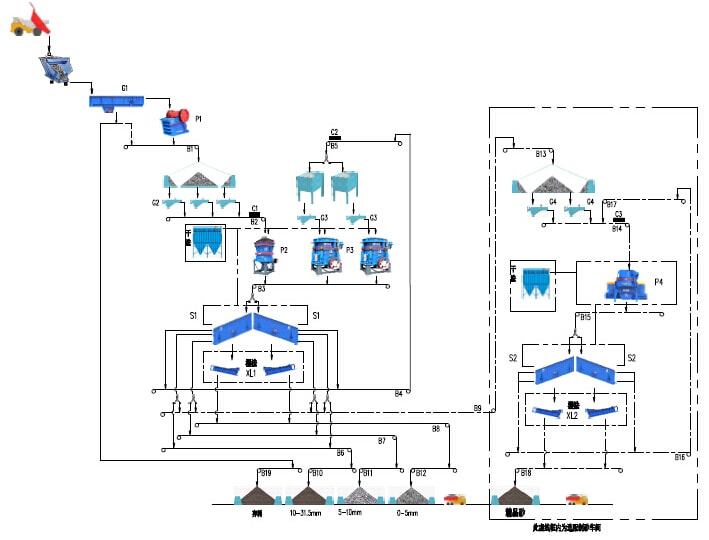 根據(jù)工程的需要,該系統(tǒng)也可以配置制砂系統(tǒng),用于生產(chǎn)合理級配的精品砂(如虛線框內(nèi)所示),當(dāng)需要生產(chǎn)精品砂時(shí),可以從一篩篩分車間篩分后分離出5-40mm的混合物料通過皮帶機(jī)輸送至制砂車間的半成品料倉,再通過振動(dòng)給料機(jī)將物料均勻的給至制砂機(jī),經(jīng)過制砂機(jī)破碎后的成品混合料再通過皮帶輸送機(jī)輸送至二篩篩分車間進(jìn)行篩分,從而分離出不同顆粒級別的成品。