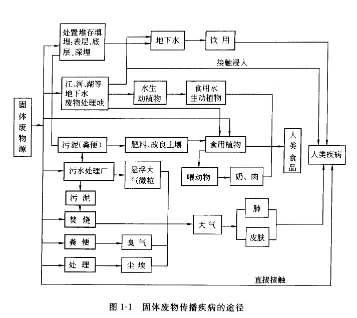 固體廢物特別是有害固體廢物,如處理、處置不當,具中的有毒有害物質(zhì)如化學物質(zhì)、病源微生物等可以通過外境介質(zhì)一大氣、土壤、地慶或地下水體進人生態(tài)系統(tǒng)形成化學物質(zhì)型污染和病原體型污染,對人體產(chǎn)牛危害,同時破壞個態(tài)環(huán)境,導致不可逆生態(tài)變化。其具體途徑取決于固體廢物本身的物理、化學和生物性質(zhì),而凰與固體廢物處置所在場地的水質(zhì)、水文條件有關,如:有些可通過燕發(fā)直接進入大氣;但更多通過接觸浸入、食用或咽入受污染的飲用水或食物進入人體。固體廢物傳播疾病的途徑見圖1—1。