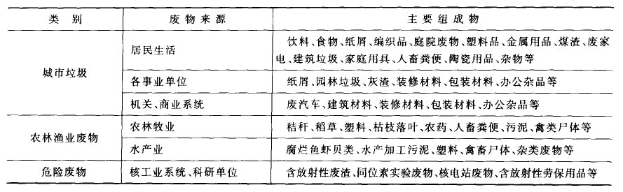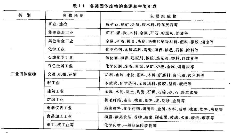 我國的工業(yè)固體廢棄物主要來自各個工業(yè)部門的個產(chǎn)環(huán)行和生產(chǎn)廢棄物,由于工業(yè)同體廢棄物常常具有毒性,破壞整個生態(tài)系統(tǒng)并對人體健康產(chǎn)生危害,因而越來越引起人們的重視,其中很多廢物劃人危險廢棄物一類進行涅慎處理。按行業(yè)可分為以下幾類:礦業(yè)、選冶,能源煤炭工業(yè),黑色冶金工業(yè),化學工業(yè),石油化學丁業(yè),有色金屬工業(yè),交通、機械、運輸,輕工業(yè),建筑業(yè),紡糾工業(yè),電器儀表業(yè),食品加工業(yè),軍工、核工業(yè)等。表1—1中列舉了各類固體廢物的來源利主要組成。