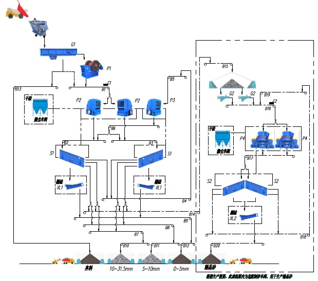 該生產(chǎn)線生產(chǎn)工藝適用于產(chǎn)量600t/h噸石灰石(白云巖)類中等以下硬度物料的加工破碎,將經(jīng)過爆破處理或開挖洞采的毛料通過棒條給料機均勻的供給顎式破碎機破碎,經(jīng)顎式破碎機破碎后的半成品物料通過皮帶機輸送給反擊式破碎機進行二次破碎,經(jīng)反擊破二次破碎后的混合骨料經(jīng)過皮帶機輸送至一篩車間進行分級篩分,篩分過后將大于用戶需要的大顆粒物料通過皮帶機輸送至細碎反擊式破碎機再進行破碎,破碎后的物料再通過皮帶機也輸送至一篩車間進行篩分,篩分過后的不同顆粒級別的成品通過成品出料皮帶機輸送至成品料倉。不符合要求的大顆粒再次返回細碎反擊式破碎機進行循環(huán)破碎。如果成品砂需要水洗也可以配置洗砂機用于成品砂的水洗,該系統(tǒng)的棒條給料機還具有預篩分功能,可以將原料中的細顆粒物料提前分離直接進入后續(xù)的破碎設(shè)備,也可將原料中的泥土雜物作為棄料預先分離。