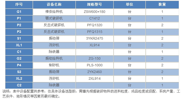 600t/h---石灰石(白云巖)類巖石的砂石骨料生產(chǎn)工藝設(shè)備配置表